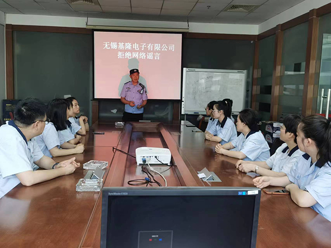 为提高公司员工对网络谣言的辨别能力和抗拒能力。2024年6月18日上午,无锡市基隆电子有限公司特邀后宅派出所民警华国强前来公司为员工进行了拒绝网络谣言宣讲活动。